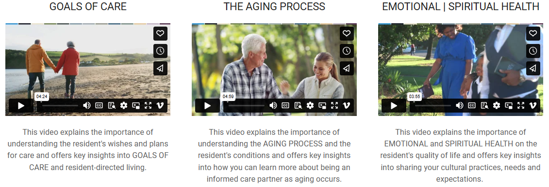 The AGING PROCESS and the resident's conditions. Offers key insights into how you can learn more about being an informed care partner as aging occurs.
