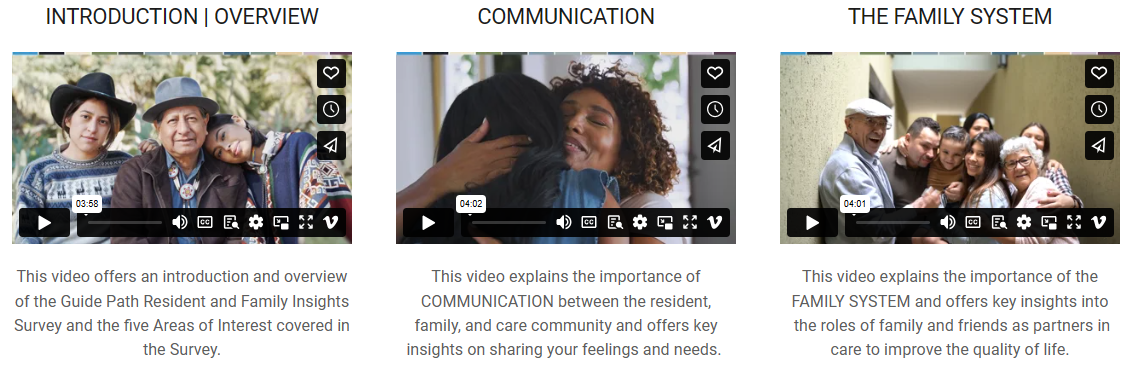 These specialized videos educate about transitions in care and set expectations in the five Areas of Interest from the Survey and begin to set a foundation around realistic expectations.