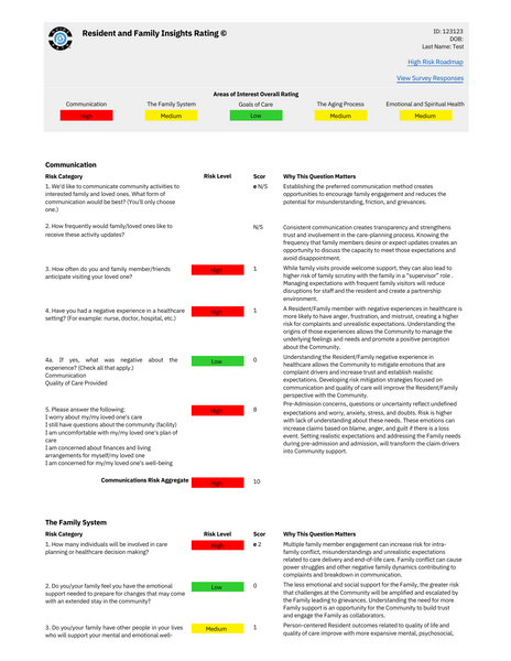 Each survey question is rated Low-Medium-High to give a sharper focus on each resident or family member's most important concerns so additional resources, attention, or engagement can be offered before a conflict arises.